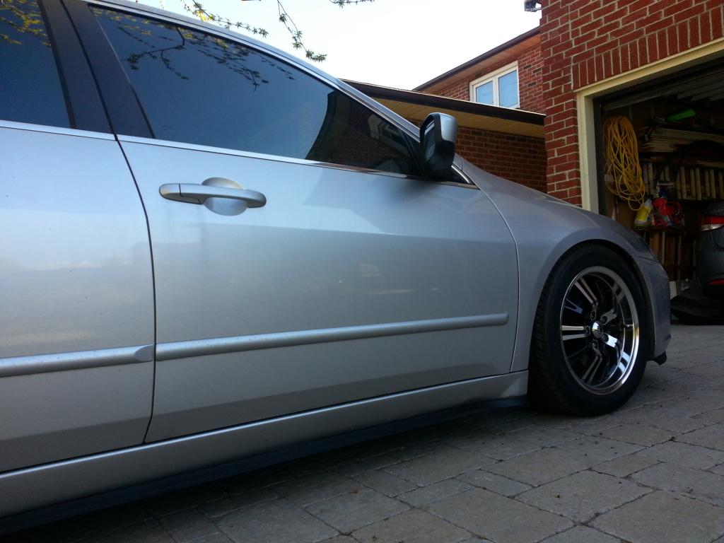 I got a bunch of scratches, even where the paint is partially gone, on the bottom of my bumper after lowering my 2007 Honda Accord EX-L, & just put on an EZ Lip (front lip & side skirts), which will hopefully protect it from now on. Just posting this here to give something back to the forums that I’ve used to help me out countless times… so here’s some pictures for anyone who’s been thinking about this product, or anyone looking for a body kit but couldn’t find anything (I can’t find any kit anywhere and I’m not paying several hundred dollars for one either). I also couldn’t find pictures of it on my car, or any 7th gen Accord, to see how it’d look. So hopefully this helps someone out there.