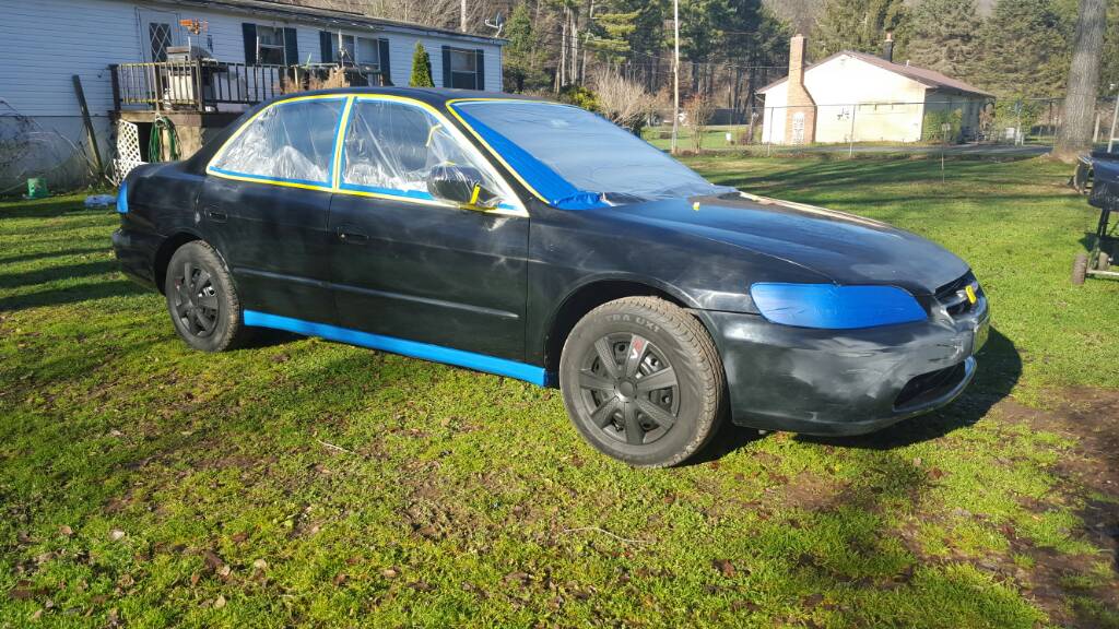 Got a new hood on Saturday with the help of my dad and my boyfriend. It was on the last car in the last row at the salvage yard, a '98 Accord LX. The new hood is dark emerald, I think, but if I'm gonna plasti dip it, color doesn't matter. It's so close to the original color you can't tell on first glance anyway. Looks so much better.