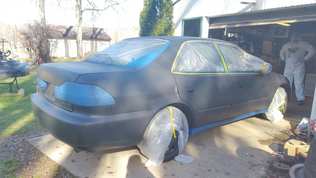 We taped it off and wiped it down very, very thoroughly with denatured alcohol before painting. My dad's first job was taping off cars to be painted, actually, haha. Before that we did body work: filled a rust hole in the left rear wheel well facing the door and primed it, you can't tell there was ever a hole there now. Filled in gouges on the hood and bumper from a truck backing into it; couldn't get it all but it looks a hell of a lot better. Filled in some little rust holes on the hood as well. I sanded the clear coat that was chipping down/off where I could with a little motorized disc sander. Hand-sanded the sun damage under the passenger side windows, rust on the rear passenger door and a little round rust spot on the driver door. That came right off, it was only surface rust left from [apparently] a magnet that was left on the car.