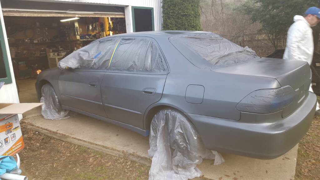 So as you can see, dad and I (mostly dad) got Selene dipped over the weekend. The finish came out a bit textured, especially on the roof, and I believe that was a combination of the sprayer not being quite powerful enough and/or my dad's never painted with plasti-dip before, haha. He was spraying a little too far away where he had a hard time reaching on the roof and center/top of the hood. I don't care about that though, I think it looks awesome! I kept the bottom trim and front Honda logo original (I taped off the whole front emblem). The rear 'H' came right off, and I have to peel the dip off the Accord emblem because I didn't want to risk breaking it trying to take it off. I stuck it back on there a few weeks ago with metal/glass adhesive and it would have been a battle trying to get it off. I have to put the LX emblem on as well, but I'm probably gonna try badge glue on that, or E6000.