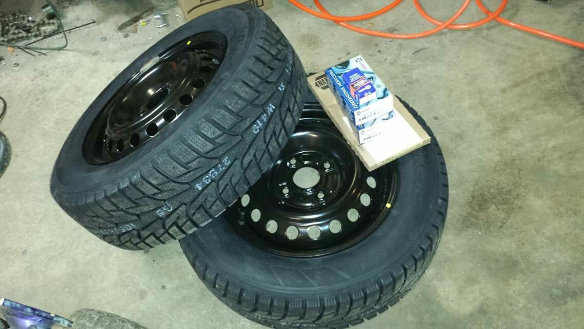 Hankook I-Pike winter tires, new steel wheels, valve cover gasket, PCV valve and sway bar links. Going up to dad's tomorrow to put it all on.