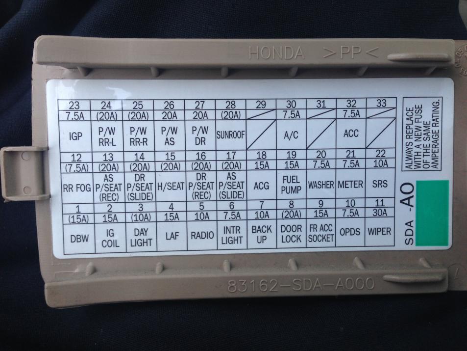 The 5-pin Lt Green connector terminal pins are: No. 1 - Wht/Blu; No. 2 - EX, EX-L: RED/BLK; No. 3 - Empty; No. 4 Grn/Red; No. 5 - Except DX - Blk