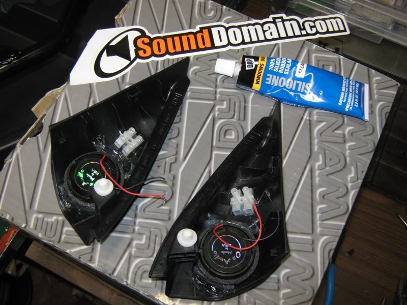 That looks good. I taped the tweeters in the spaces. I then applied superglue around the seam where the speaker and the panel came into contact. We will see how it holds up. If it doesn't I will do the silicone around it to keep it in place.