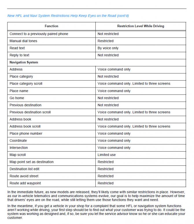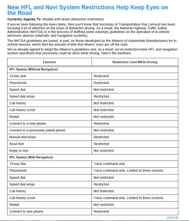 The system still disables functions with the vehicle moving (as designed), but the voice navigation seems to be more effective. I was forwarded documentation through the dealer that Honda is responding to future guidelines being developed by the NHTSA to minimize driver distraction, and all of their vehicles will go this route in future models. See partial paste below.