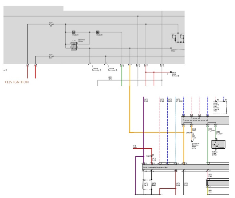 Schematic showing the premium touchscreen HU reverse wire (through relay). HU receives a +12V switched signal when in reverse.