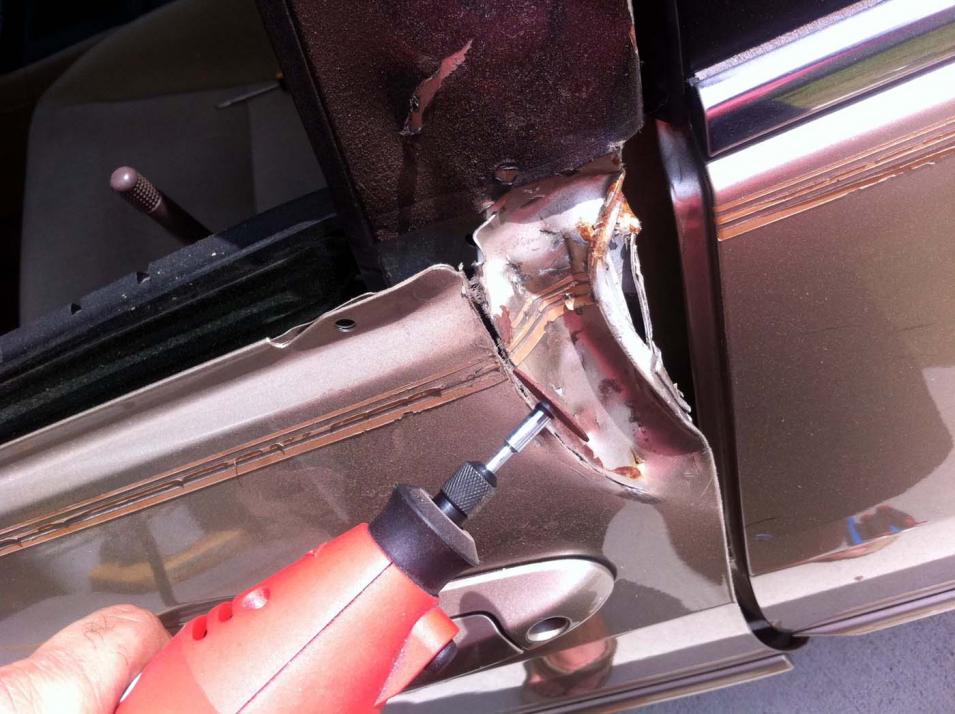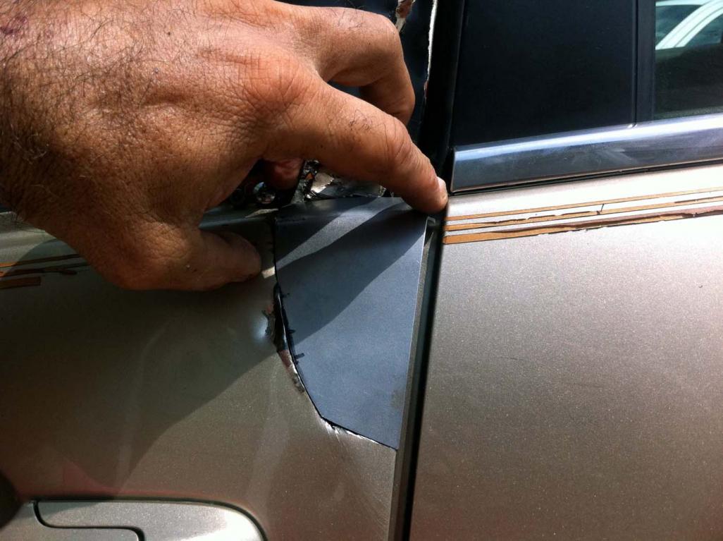 I had to cut out the part that was damaged and weld a new piece of metal instead and then paint it. I also had to replace part of the windows frame as you can see.