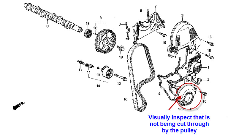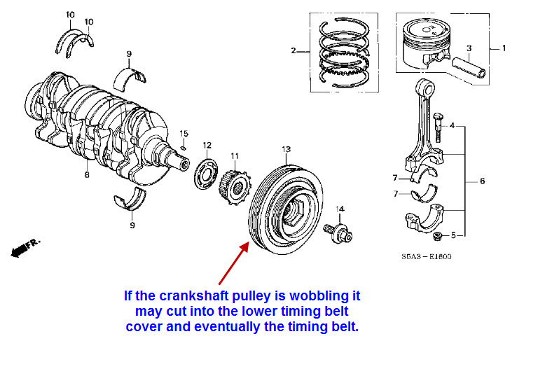 Visually inspect the lower timing belt cover to see if it is being cut through by the crankshaft pulley. If the crankshaft pulley wobbles, it may cut into the lower timing belt cover and eventually into the timing belt.