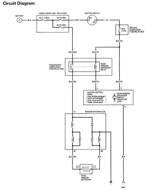Yes, from the control unit, ground is applied to the relay from the BRN/YEL wire, this activates the "coil" in the relay- + to the other side of the coil comes from the fuse (#3 7.5amp) via the BLK/YEL wire....once the coil "closes" the relay power from the WHT/GRN is allowed to flow to the BLK/GRN wire that goes to the window grid.