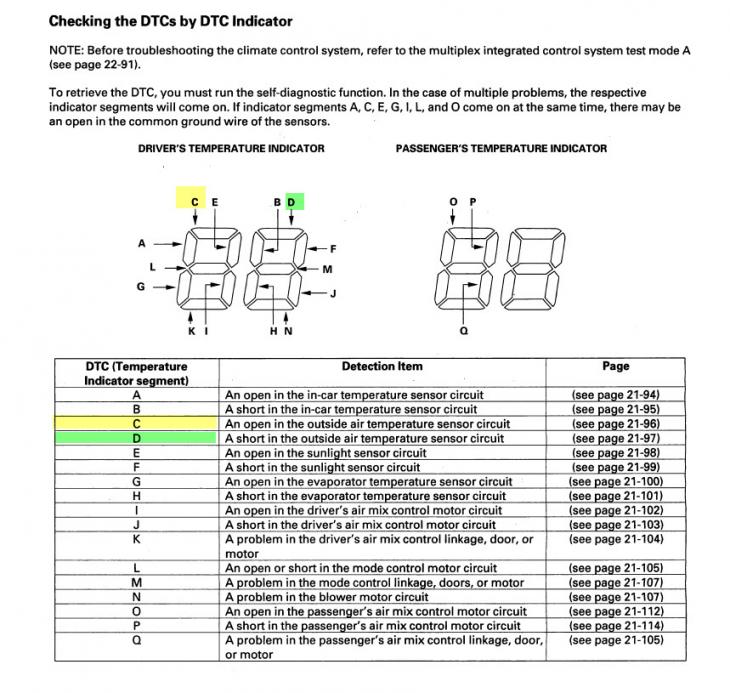 The trouble code you have is either "C", "D" or "F", depending on whether it is the left or right driver's side temperature indicator. (See attached image.)