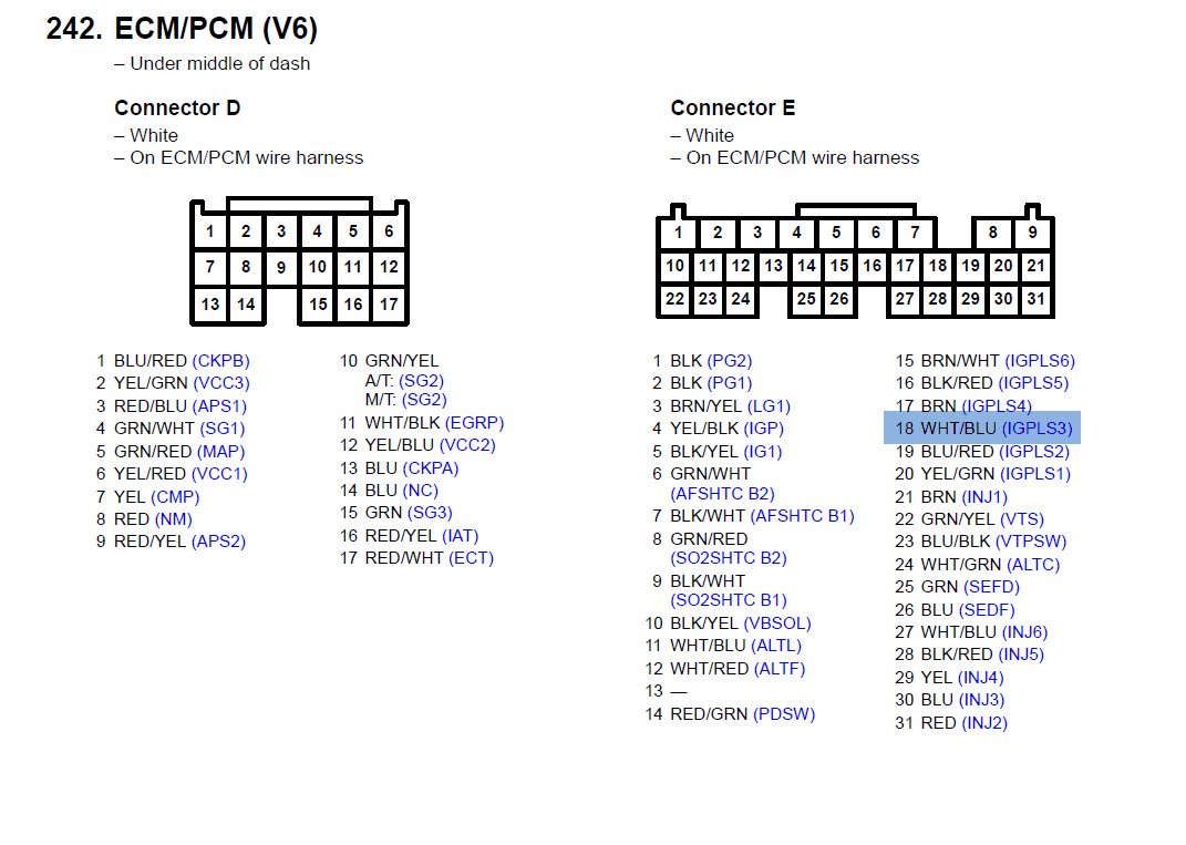 The Wht/Blu wire at E18 for a V6 is the ignition control wire for coil no. 3.
