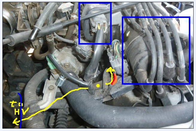So i picked it up along with prestone. Its the hose that's labeled, in PoorMan212's picture as "Heater Inlet Hose" (from the heater valve to the engine. A huge whole is blown out of it where the hose goes into the engine. I uploaded a picture , and I have a question. ( My paint skills are REALLY lacking - the yellow dot is the hose and the red orange is where the hose blew out). The heater valve side is easy to swtch out. But the engine side is not easy to get to. ANy ideas - I think I have to try to remove oneof the ite,s in the blue boxes. I guess the one on the right is the distributor, but I think the other one (what is it?) might give me more direct access.