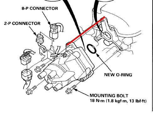 The next, I drew a red line on one of the "ears" of the dist that would be a good place to "mark" the dist and cyl head for re-installing the dist and keeping the timing in place.