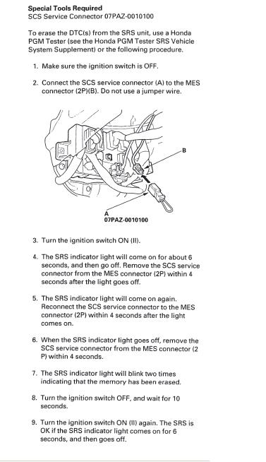 I disconnected the battery for a few minutes, then reconnected the battery resulting in the Check Engine light NOT illuminating. However, the SRS light still comes on. Is there a reset procedure for the SRS System?