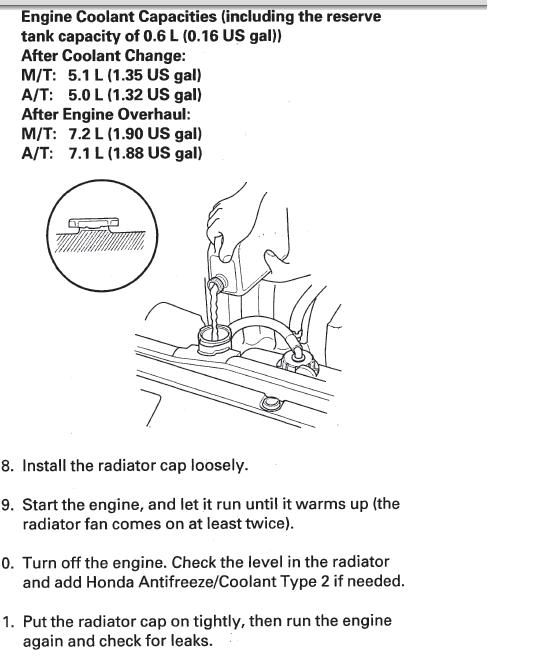 Instructions on changing coolant, air bleeding/purging are in the owner's manual. Since the heater valve is motorized, you'll have to turn the Ignition to ON (II) and then turn the temperature control to high to open the valve.