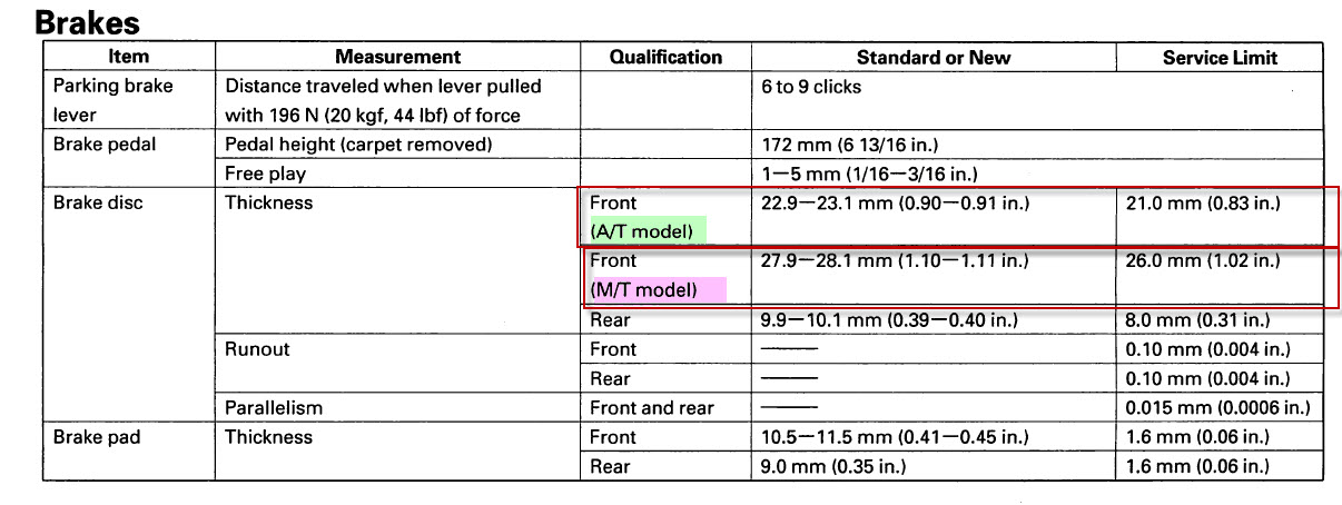 - For V6 with manual transmission, Honda calls them 16 inch brake type and yes, the rotors size is smaller than that. The front brake rotor is 11.8 inches.