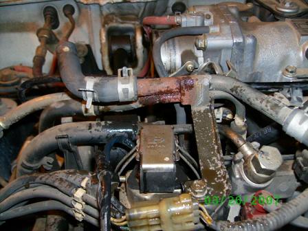 I cleaned the TB and started it up and the small metal tube below the valve cove tube has a pinhole leak that was spurting antifreeze out of it (see pic). the valve tube was puting out a lot of smoke at the beginning but after I shut it down for the first pic I wanted another one of the leak in action, there was no smoke coming out of the valve tube. is that of any significance? the engine was shut down for less than a few minutes.