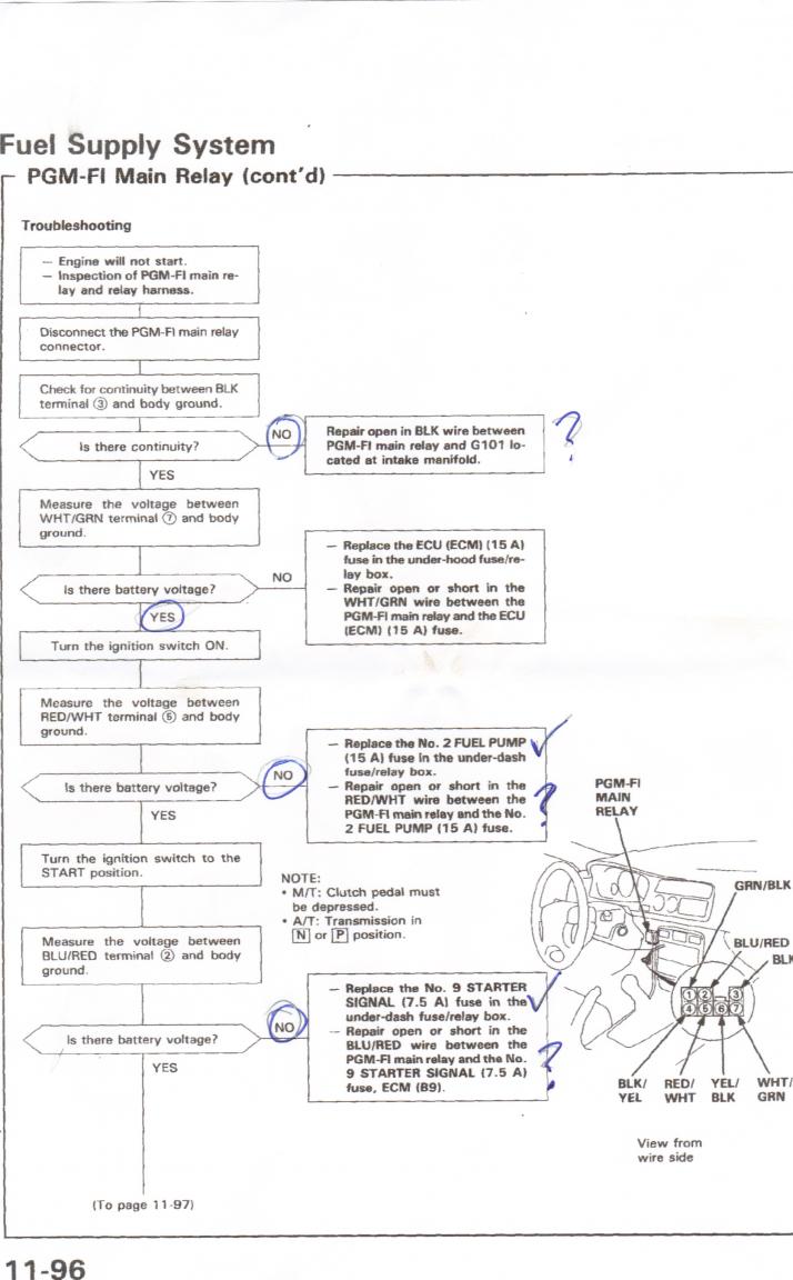 The checks on page 11-96 are actually checking the car's wiring, not the actual relay. You did those checks with the relay unplugged, & you're measuring into the wiring harness (not the relay), right?