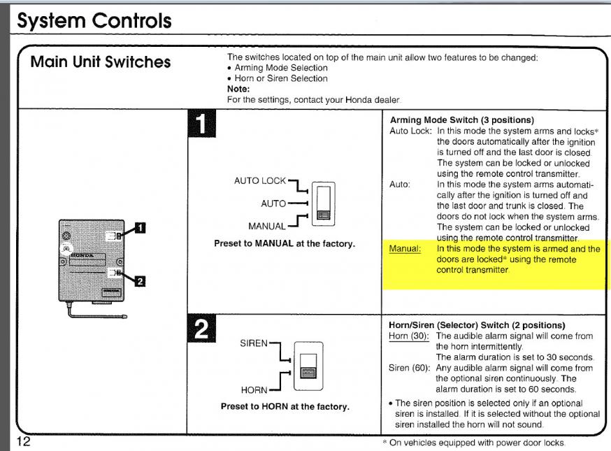 The dealer installed Honda alarm, arming mode can be switched to Manual mode, so it doesn't automatically arm.