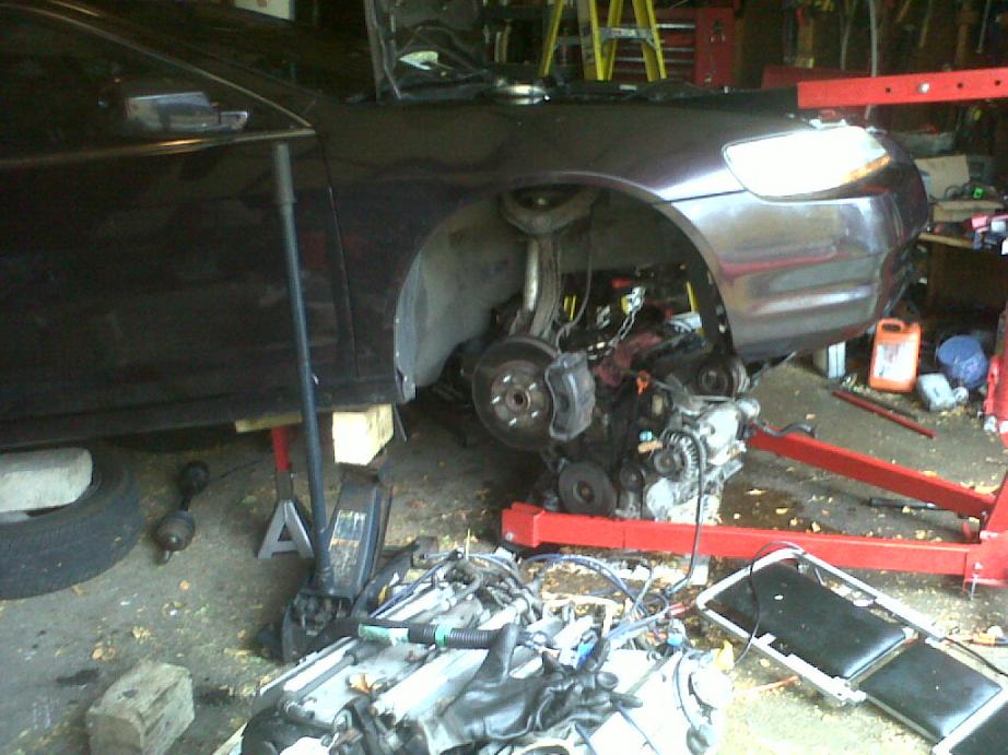 Here's how I did it in my garage without a lift just two hydraulic jacks and a Harbor Freight Engine Hoist. Two pictures are worth a thousand words. Once you remove the front sub frame you have more than enough clearance especially if you remove the upper plenum.