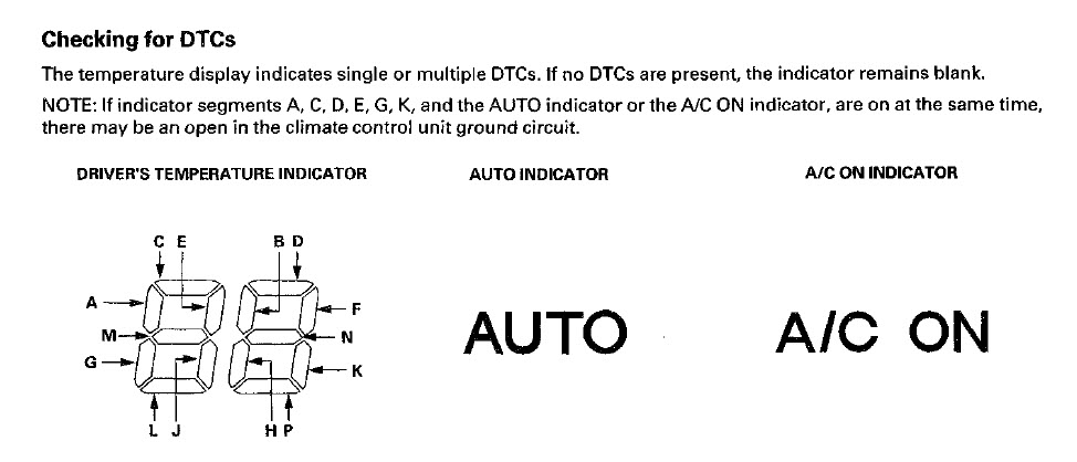 · If there is a problem with the system, the temperature indicator flashes 88, and the A/C ON indicator or the AUTO indicator (or both) also flashes. Segments in the temperature indicator then indicate which DTCs are present.