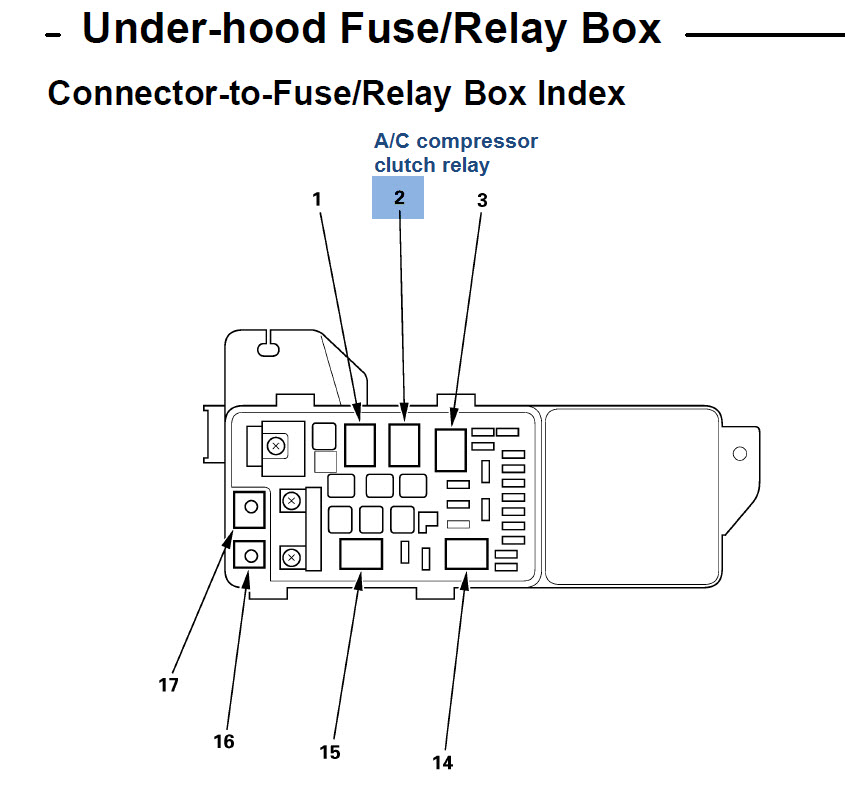 1. The A/C compressor clutch relay is number 2, as shown in the attached under-hood fuse/relay box diagram.