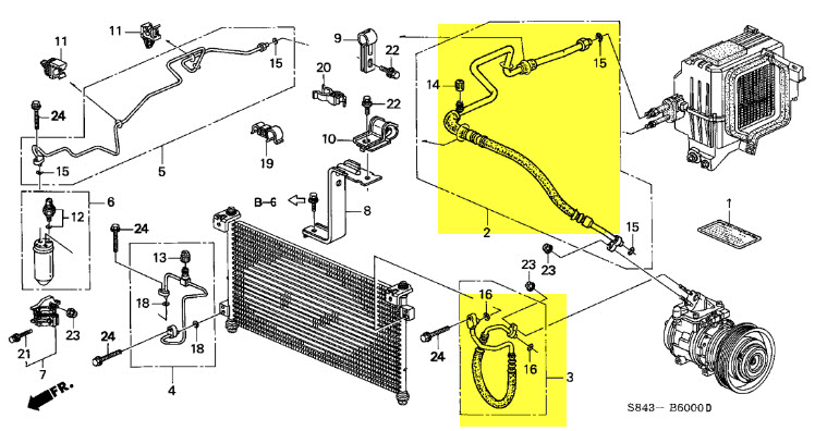 The line from firewall to Receiver/Drier is not a hose, it's an aluminum tube. See any of the Honda parts sites (Majestic, etc). It's called receiver pipe and cost about $35.