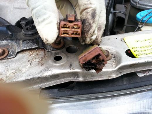 So I found both the Condenser Fan Relay (I'll call this CFR) and Compressor Clutch Relay (I'll call this CCR). I disconnected both relays and found that the CFR connector was busted (see picture). The previous owner removed these relays from their original location and zipped tied CCR to my PS Steering fluid hose while the CFR was just hanging off at the bottom . Took me a while to find CFR.