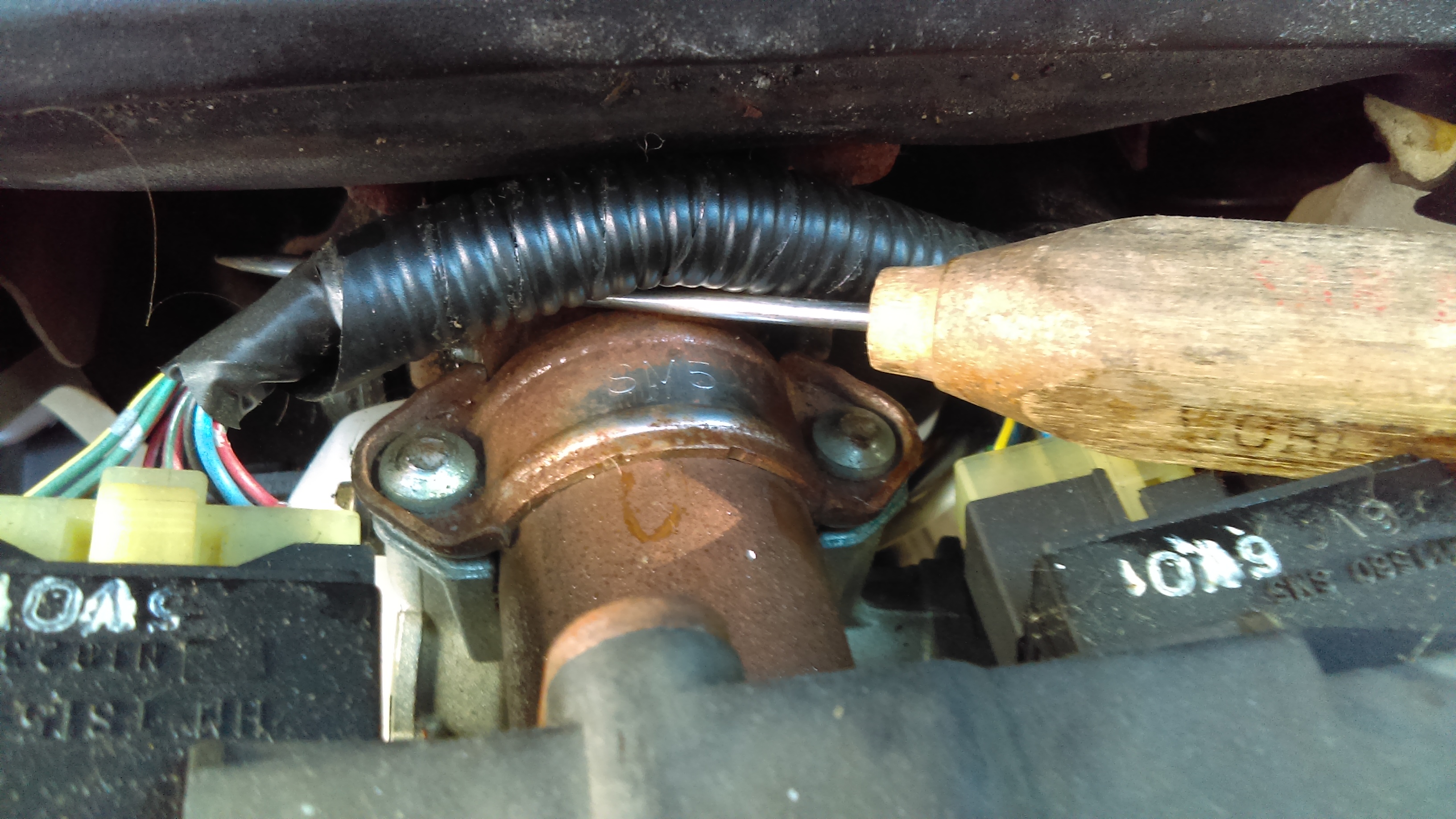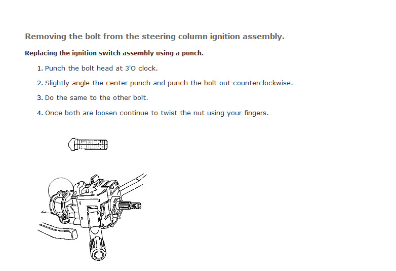meanwhile i've been able to open that whole steering column area up, thinking to replace the whole column lock cylinder assembly as everything i'd read on the net had indicated all i needed was an 8mm socket to free the assembly from the column but - at least on my particular model - while the heads of those 2 bolts are visible, there are no 8mm bolt heads that i can latch onto to twist 'em loose. no 8mm square or hexagonal or even slotted heads but rather utterly round and rounded blank heads. i am at a loss here as to how to remove these particular bolts holding the assembly to the column, short of taking a chisel to at least one of 'em.