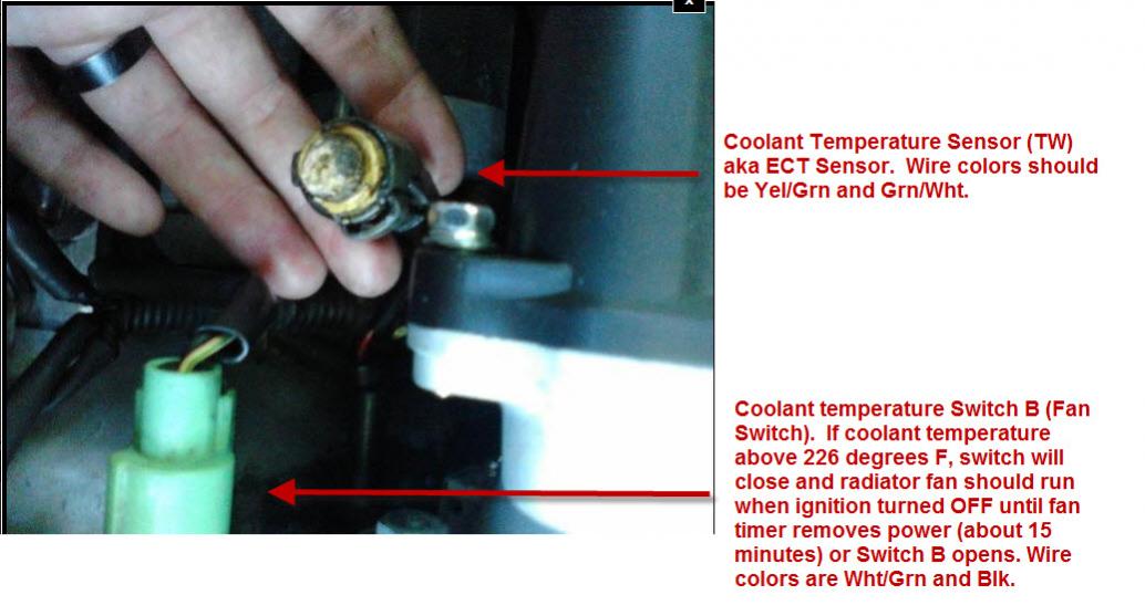 The green connector with the Wht/Grn and Blk wires is for the fan Switch B. If coolant temperature is above 226 degrees F, switch will close and radiator fan should run when ignition turned OFF until fan timer removes power (about 15 minutes) or Switch B opens.