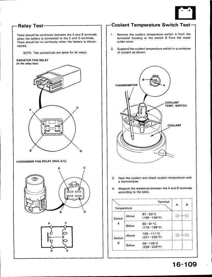 I have a feeling youre right and the fan timer unit is bad which is why the fans are doing the wrong thing when theyre jumped. It seems like the creative wiring doesnt extend into the harnesses or anything just like they tried resplicing things to see if they could make it work. Anyways I found this in a manual to test the coolant temp sensor # 14 and 15 on the diagram. Its testing for resistance. It says to measure resistance between the two terminals and compare it to the chart however I dont see any resistance numbers on the chart or anything unless those barbells mean something and I dont understand what its saying??? Also the next page in the manual is off to another topic So it says to measure resistance but doesnt tell you what it should be, Only thing I can think of is that barbell means 0 resistance at that temp??