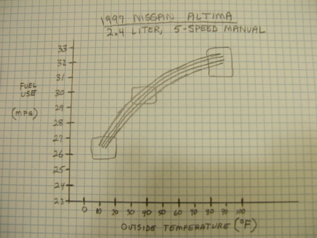 a few yrs ago I did a calculation on fuel economy vs ambient temp for a Nissan Altima, 2.4 L, 5 spd. based on my fuel records. Found a surprisingly strong drop with temps as moved from 80's to 40's to 20's; I might try to find the chart eventually, but it went from ~33 to 24-5 mpg or so in similar driving.