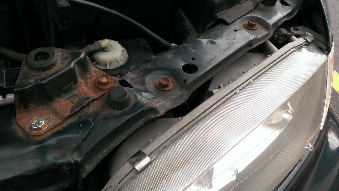 Anyway, a couple years ago I was involved in a little fender bender that didn't bend my fender at all. Instead it got my hood and that bit of frame that holds the headlamp on. I've attached a few pictures of what I'm talking about. My question is: what would be the easiest way to bend this true again? Just wrench it out? I've never done any sort of body work before, only engine and related so this is a new area for me.