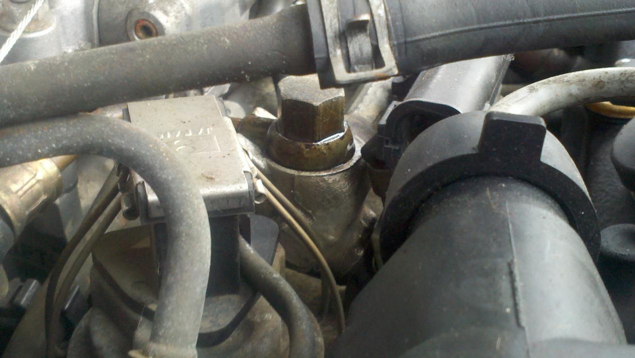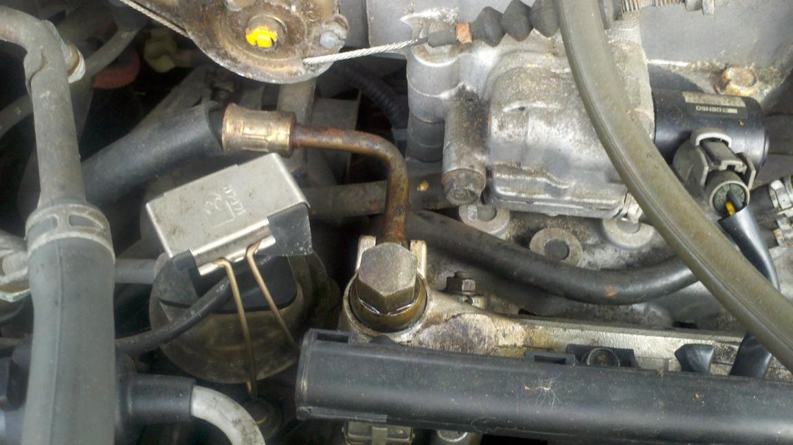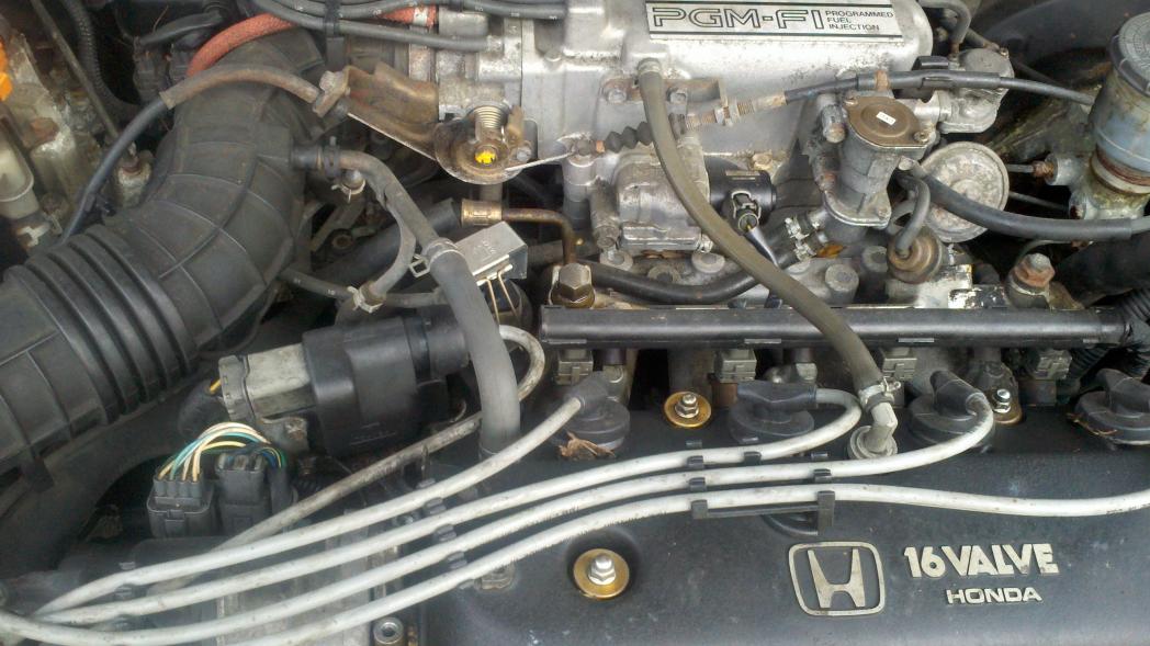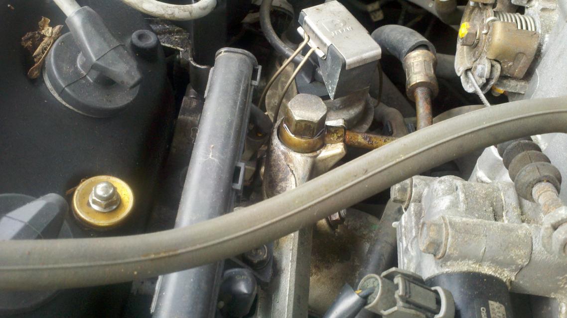 I just got my 92 EX Sedan back on the road. I've been driving it daily for 3 days now. On the second day I noticed a hesitation/bobble on throttle, when accelerating from a dead stop. I looked around under the hood, and noticed this part was damp. I touched the fluid, sniffed and determined it was fuel. There seems to be no spraying, or pouring of fuel out of this part, but just enough to wet whatever part it is. I have attached pix of what I believe is my problem. It is the 'golden' colored piece right behind the fuel rail. I figure it has enough of an escape of fuel to allow injector pressures to lower and cause my hesitation. It is the size of a 17mm socket. If anyone can identify this part for me, and give some advice on how to remedy this, I would appreciate it. Thanks ahead of time.