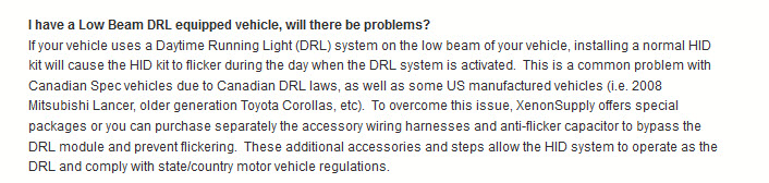 As noted on Xenon Supply website’s FAQ (refer to attached pic.), their anti-flicker capacitor is to bypass the DRL module on cars which use the low beams as DRL.