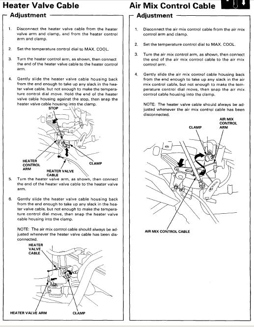 Both heater valve cable and air/mix control cable adjustments are shown from a Honda service bulletin as part of my post # 15 and 16 in this other thread, which was previously reference in my above post #12. The service manual does not show the same level of detail for the air/mix control cable adjustment as the service bulletin.