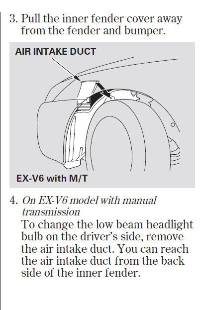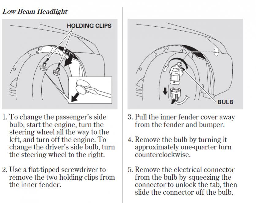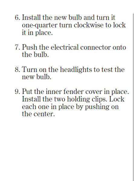 Changing the headlights on your car require turning the steering wheel and partially removing the inner fender to access the bulb. (For coupe V6 with manual transmission, an air duct is also removed for the driver side.