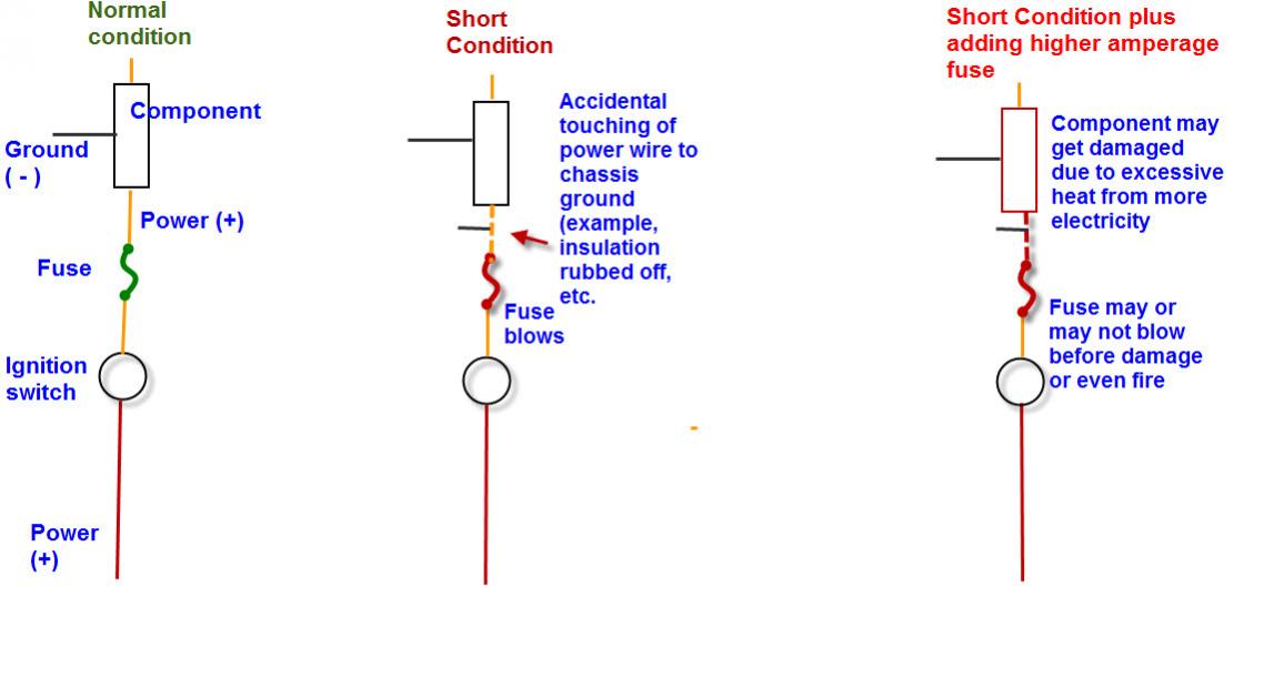 I made an illustration showing possible scenario, etc. The short can also be at a connection, component, etc. and anywhere along the circuit. A short is an accidental connection of a wire to ground or to another wire.