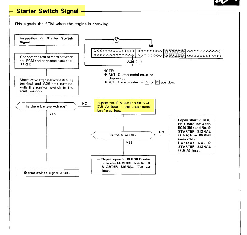 · For M/T, the clutch pedal must be depressed. This allows power from Fuse No. 9 through the clutch interlock switch.