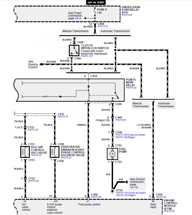 Under-dash Fuse No. 9 (7.5A) protects and provides battery power (+) to the (1) brake bulb check circuit, (2) ECM start input, and (3) main relay (fuel pump relay). It is called the “Starter Fuse” (not to be confused with the starter motor). A more apt name probably should have been “start input fuse”.