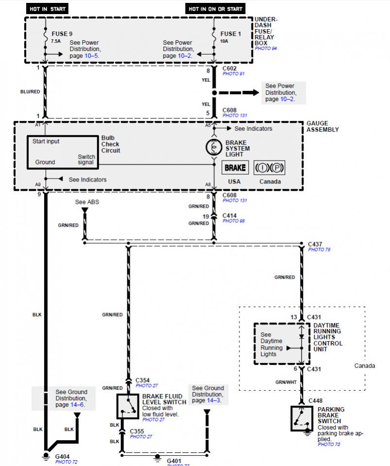 With the ignition switch in START (III), and clutch pedal depressed or A/T gear selector in PARK (P) or NEUTRAL (N), voltage is applied through fuse 9 to the bulb check circuit. The bulb check circuit closes, allowing current to flow through the brake indicator system indicator light and bulb check circuit to ground. The brake system indicator light then comes on to test the bulb.