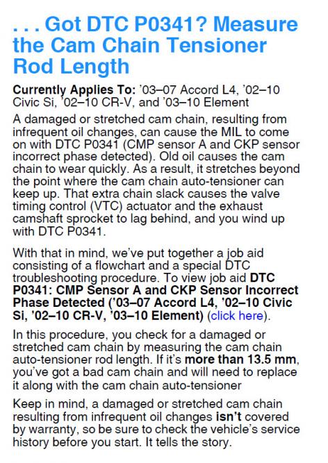 A damaged or stretched chain will set the P0341 trouble code. Infrequent oil changes, etc. can cause the chain to wear quickly.