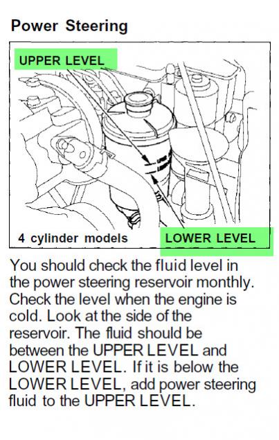 Q: How does the power steering reservoir fluid level look? You can check this anytime, it should be between the upper and lower lines (see attached pic.).