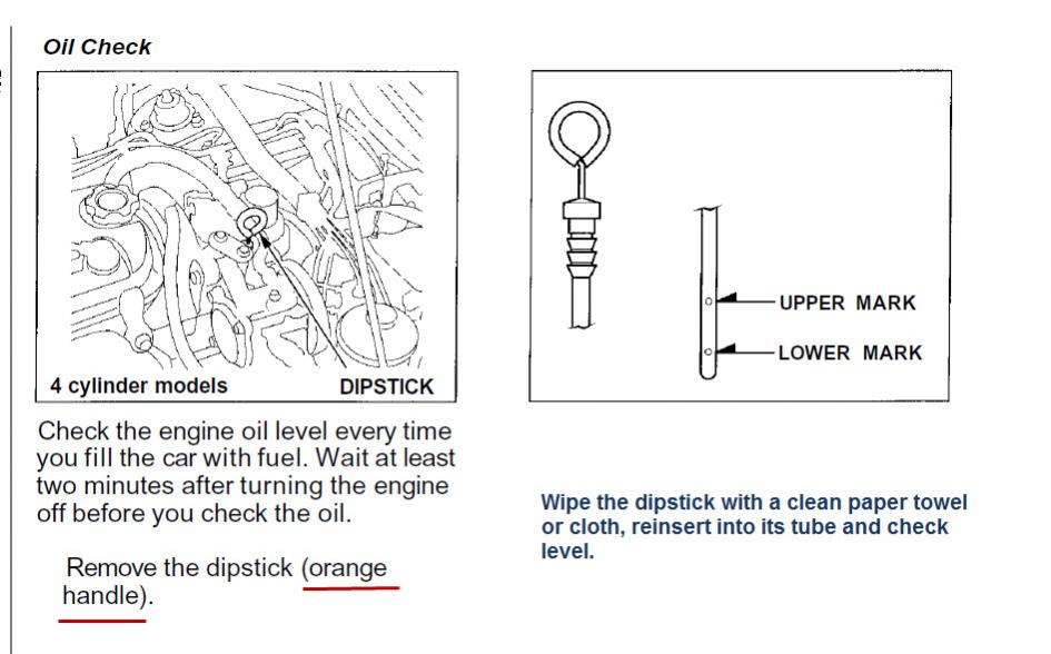 Q: Also check the transmission fluid (yellow handle) and engine oil (orange handle).