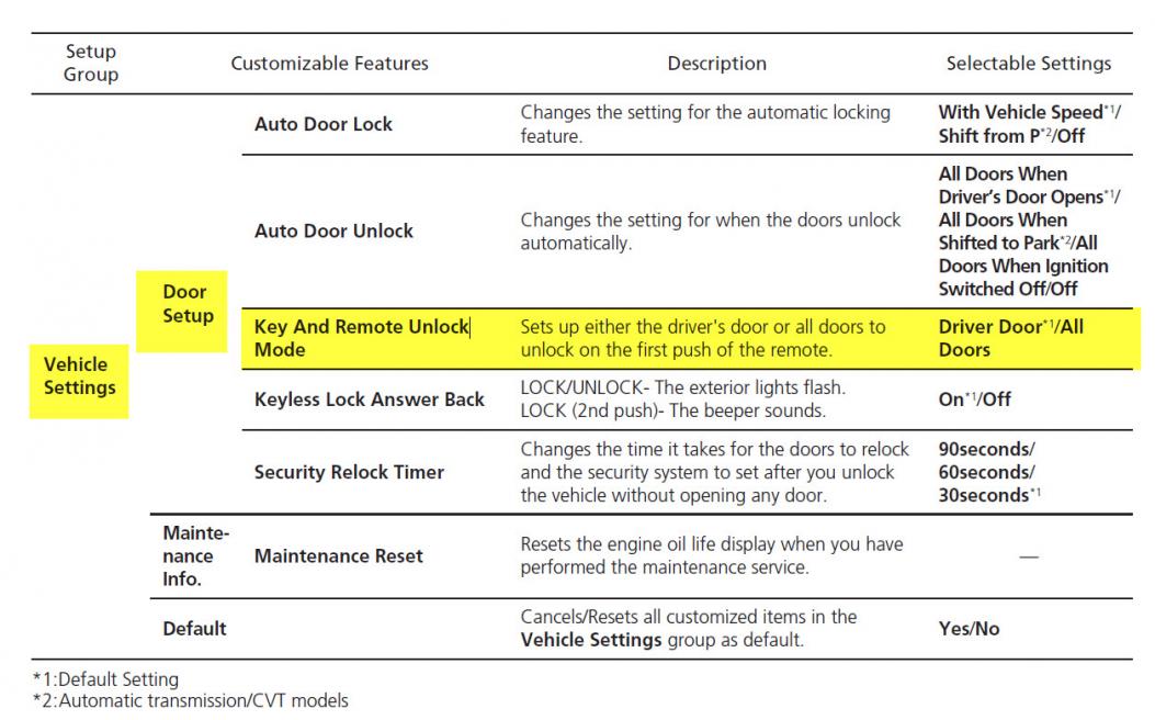 For a CVT, car has to be in Park to change the customizable settings. Check again to see if the setting for "Key And Remote Unlock Mode" was changed to "All Doors" after the first time you tried to changed it or did it still show in the default mode.