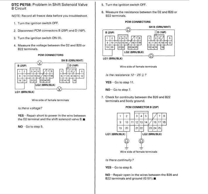 One pic shows the testing of the solenoid...note which on goes to the POS + and which goes to the NEG -...then the first page of the testing for the P0758 shows which pin is which.