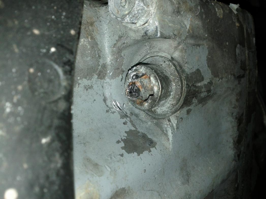Here are some pictures of the offending bolt. I tried using a vise-grip but there just isn't enough room for it to properly bite down on the bolt. You can see some of the marring the vise-grips caused in the surrounding areas of the trans. body. I tried using a 3/8 ext but again there was a clearance issue as it hit up against a metal support piece of the body. I'm just considering taking it to my indy and having him deal with it.