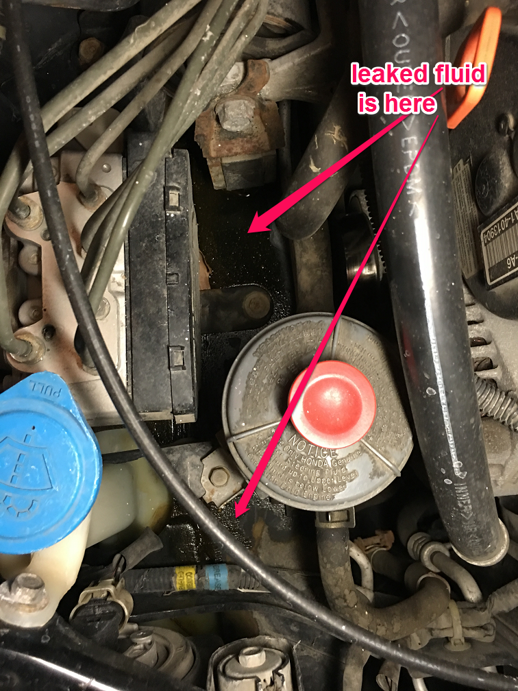 I cleaned up the area around the steering lines and reservoir and then took the car for another drive. I noticed some more leaked fluid after the drive as shown in the first photo. I traced it to the source and it seems to be the motor mount as shown in the 2nd photo. Does the motor mount have fluid in it?