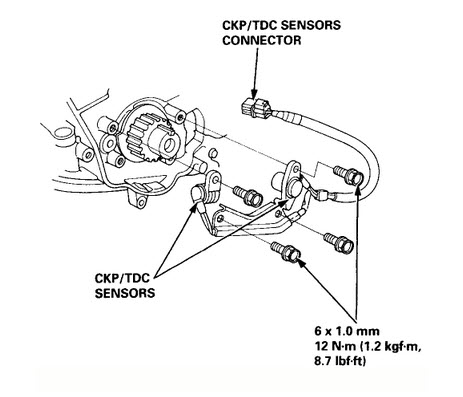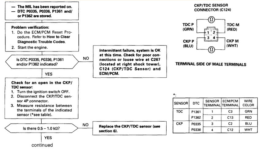 On your 96, the Crankshaft Position/Top Dead Center (CKP/TDC) sensor should be located just below the crankshaft, fastened to the oil pump housing. First, check that connector C124 terminals and wiring are okay (see pic. of C124 connector.