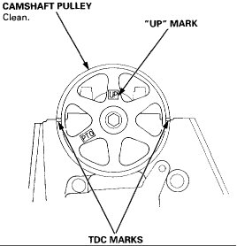 At any rate, for the life of me, I cant figure out the timing marks on this beast. On the cam pulley, all I can find is an arrow on the inside of it [valve cover side]. If I move the cam so the arrow points straight up, the cam is in the firing position on the #1 piston... Is this my timing mark?