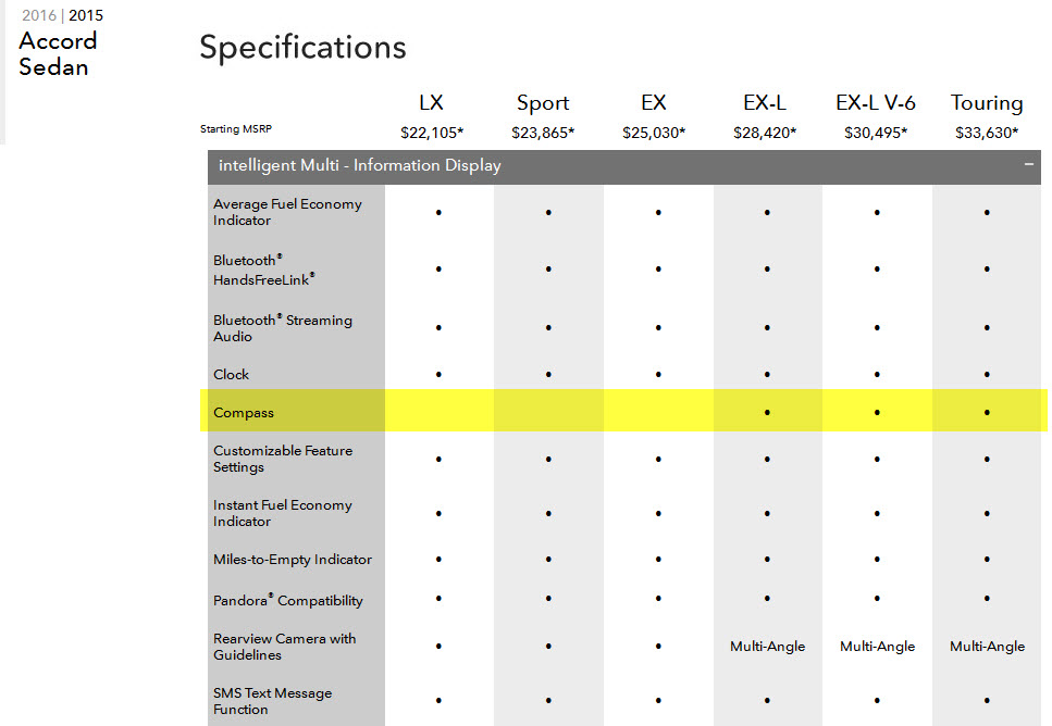 is the Imid compass (shows up next to the clock) standard in the 2015 EX-L V6 with NAV? I just bought a CPO 6MT and there is no compass showing on the screen. Was that a ploy by Honda to make you buy the rear-view mirror with the compass (mine is auto-dimming only, no compass).